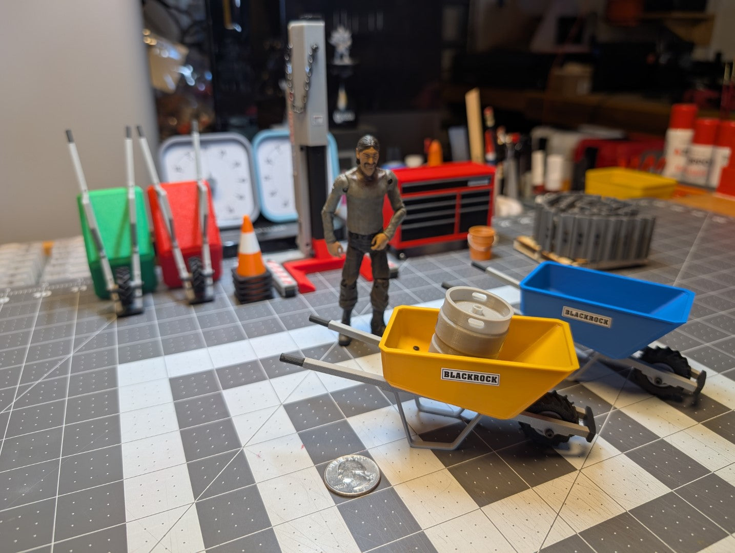 If you're doing mini work, you need a mini wheel barrow. These rough terrain beasts carry rock (pebbles?) and dirt (sand?) or spare change (I won't judge). These are good on your desk, in your diorama, or with your scale radio control vehicle setups. The deep tub and long handles make this a comfortable ride when your buddy (if they're 5-inches tall) needs a lift.